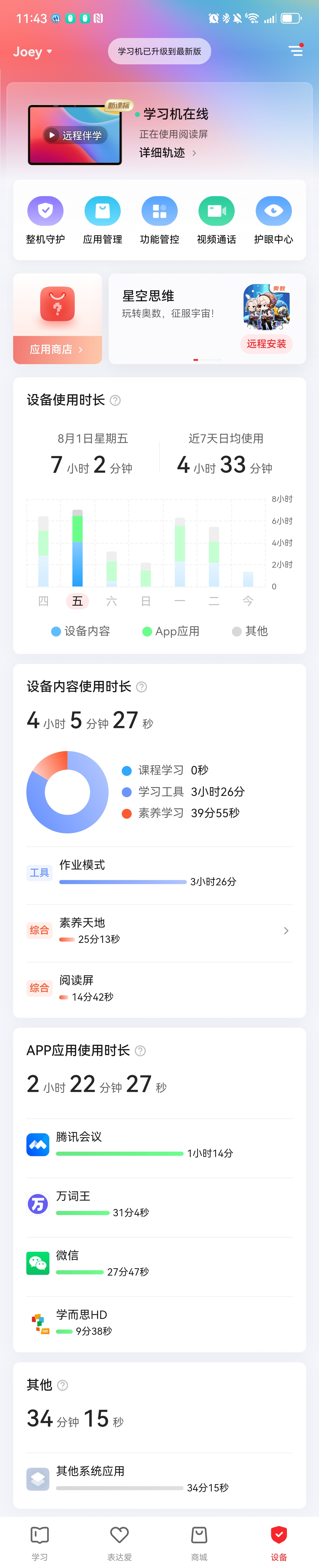 学而思学习机在家长端【学而思亲子】的协助下,就可以做到全方位的管控。