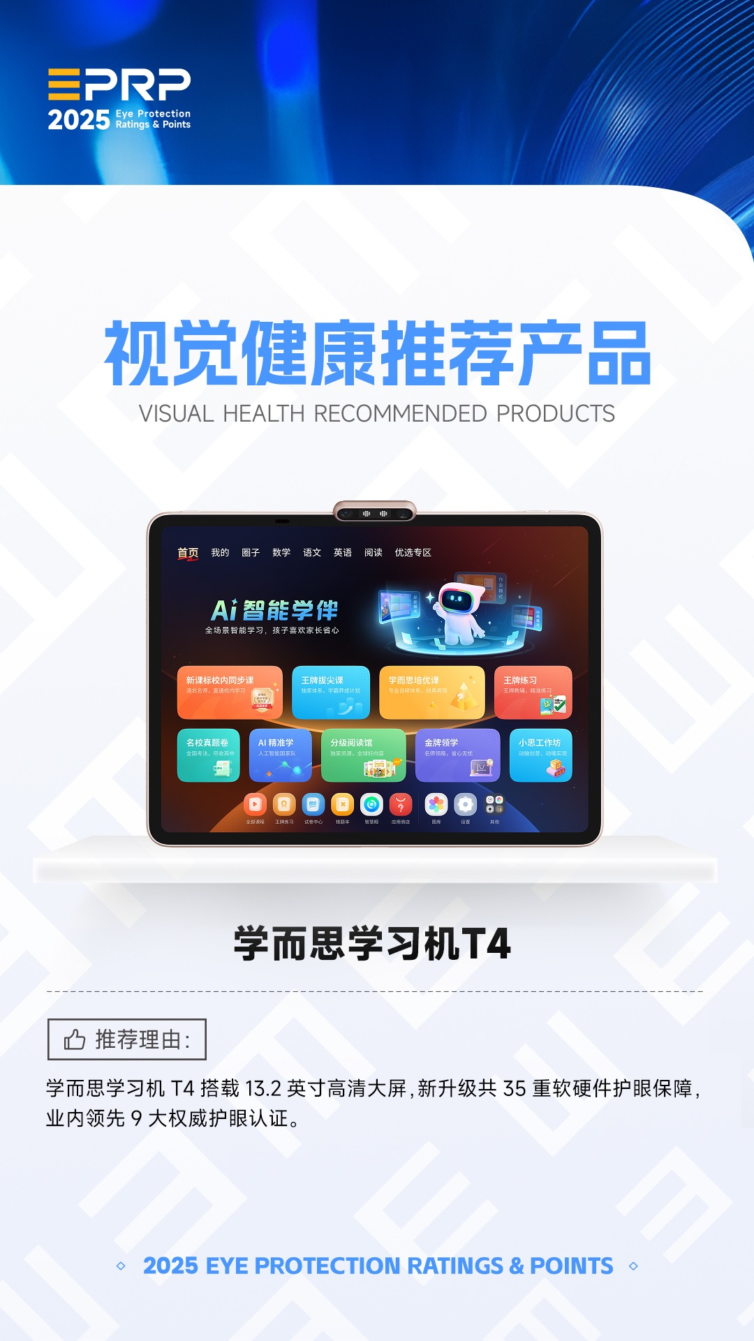而且在7月16日召开的第二届健康显示大会上,学而思学习机T4 Pro凭借卓越的护眼性能,荣获了“金E护眼认证”视觉健康推荐产品认证:
