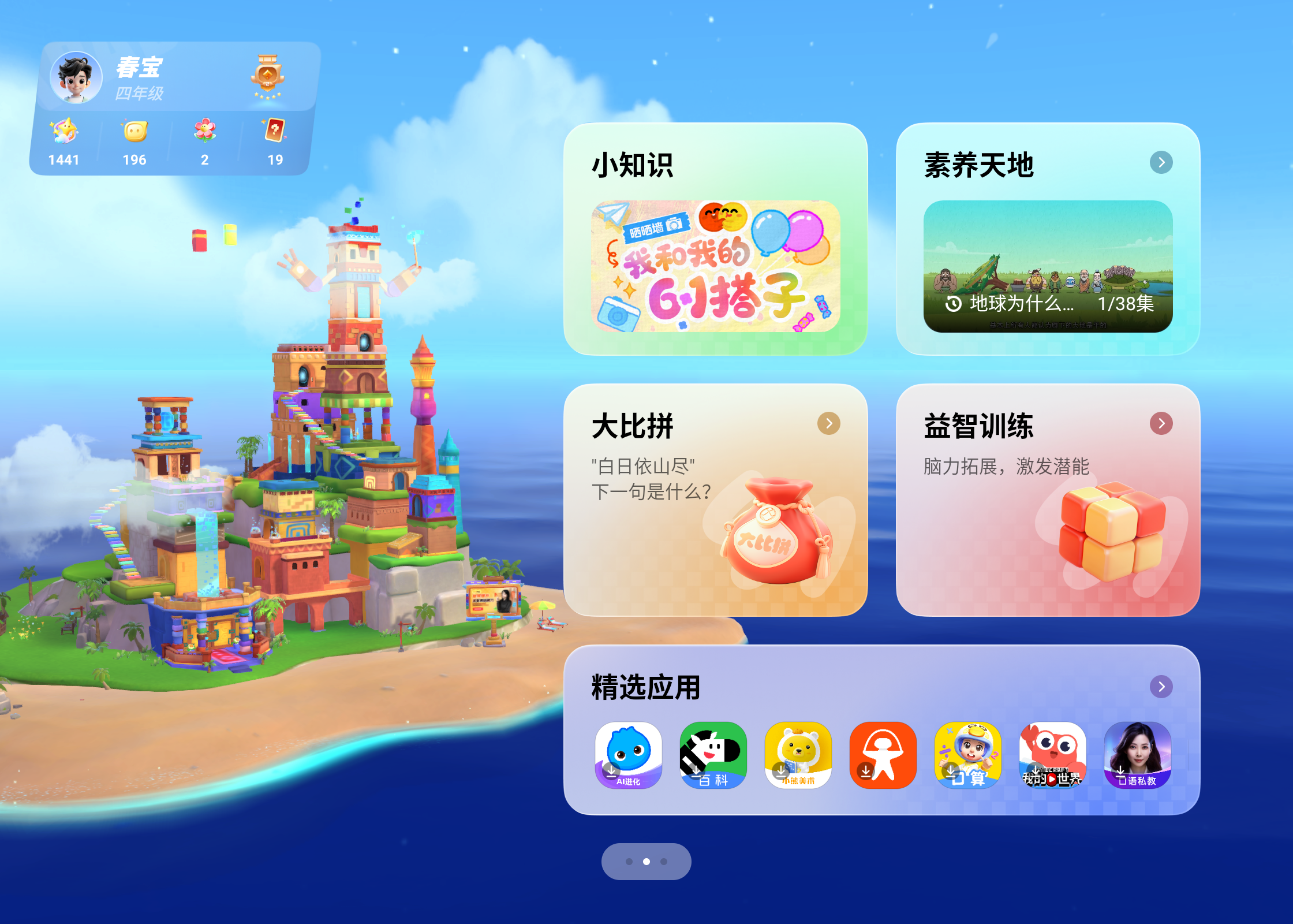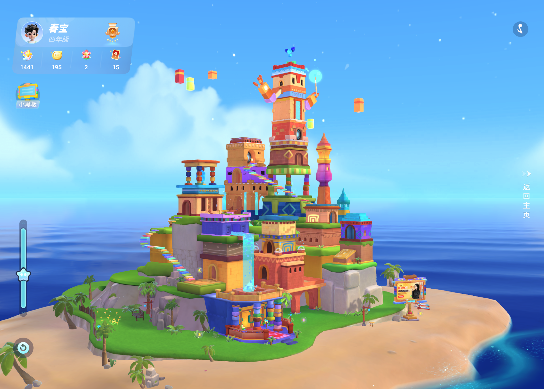 一进入左侧最显眼的就是一个炫酷的3D 大城堡,坐落在蔚蓝的大海上,阳光沙滩和美妙的音乐,可放大可缩小,360度动态旋转,还可以收集星星和卡牌,放烟花,实在是太疗愈了。