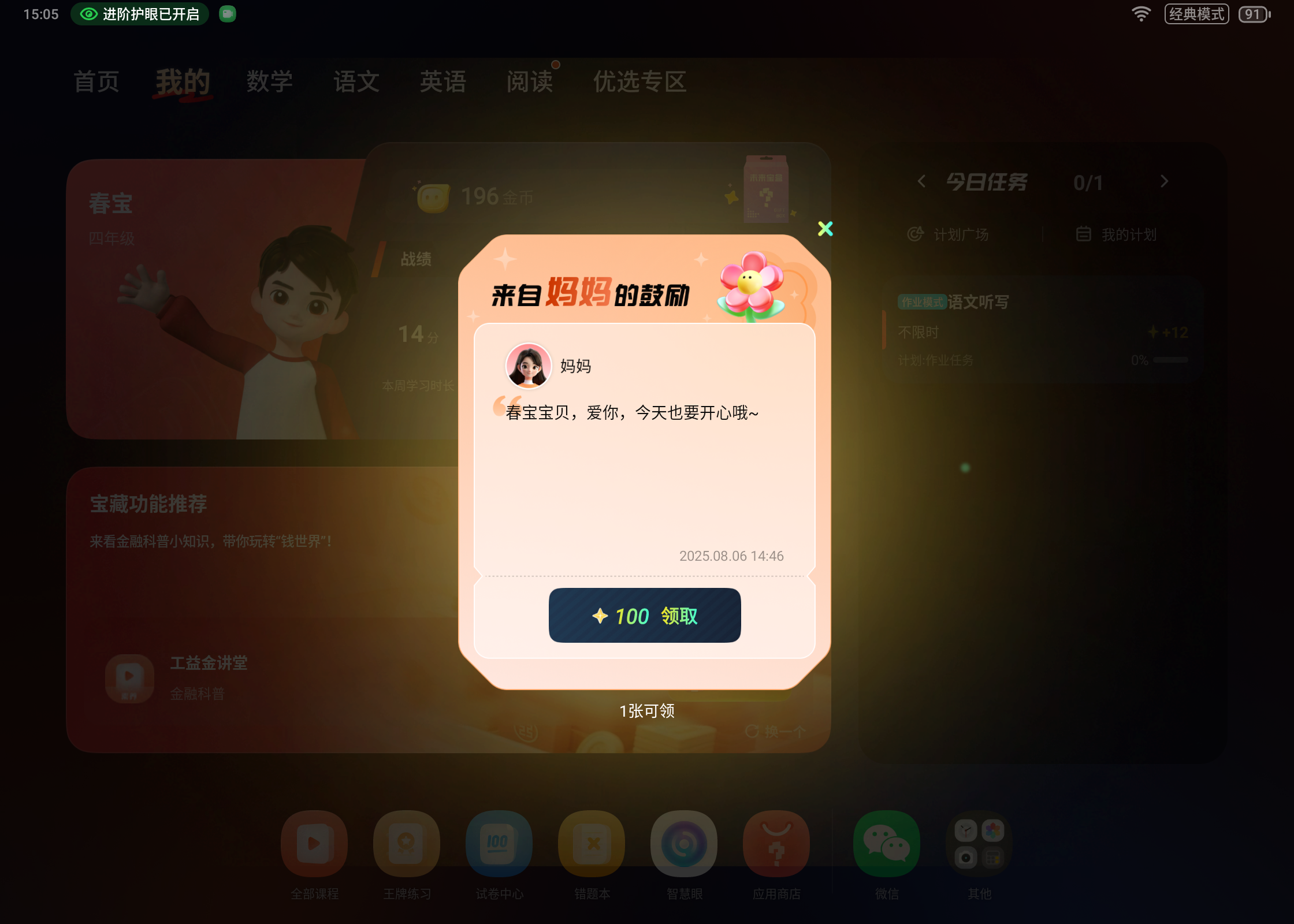 还可以通过家长端【表达爱】的入口来给孩子点赞,孩子就会收到100星光值的激励,这些虚拟的奖励在大人看来也许不值一提,但在孩子的眼里,代表的可是自己用努力换来的突破,也代表着妈妈的爱和关心,有着特殊的意义和非常正面的激励作用!