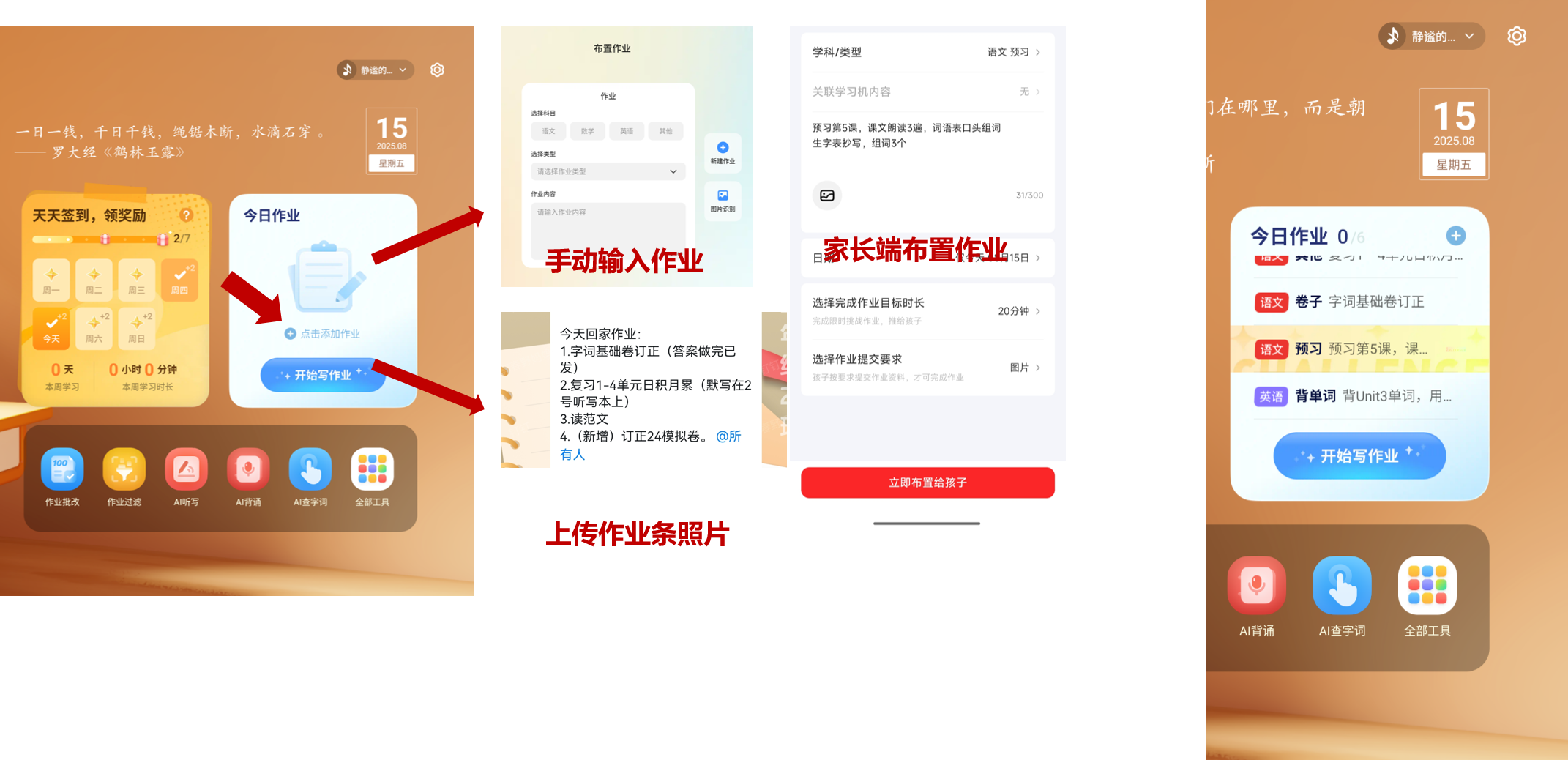 家长可以通过手机端布置任务,孩子自己也可以在学习机里面拍照上传老师或者家长留的作业单,学习机上就会出现清晰“作业清单”,顺序、数量、用时一目了然。