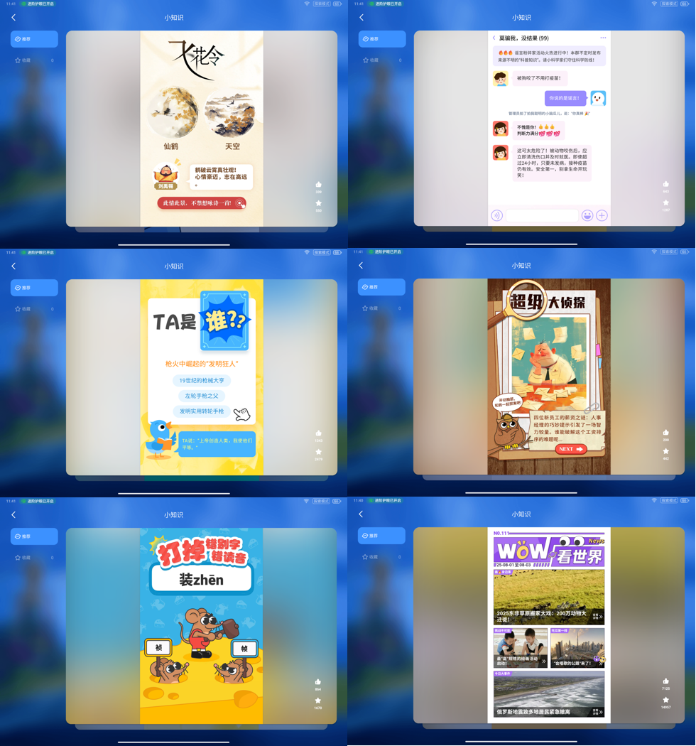 探索模式通过沉浸式的体验设计让孩子一眼喜欢,更有趣味小知识、素养天地、互动比拼和益智小游戏,生动有趣,寓教于乐,让孩子在学习之余沉浸式放松。
