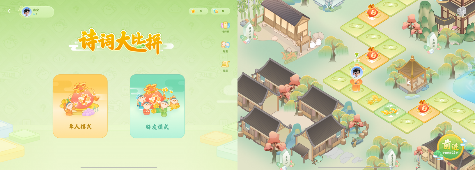 诗词大比拼的设计可就更加有巧思了,把孩子们头疼的古诗词做成了大富翁式的游戏形式,扔骰子→踩格子→触发诗词任务,答对就能拿积分和金币。除了能单人沉浸式闯关还可以邀请好朋友组队pk。