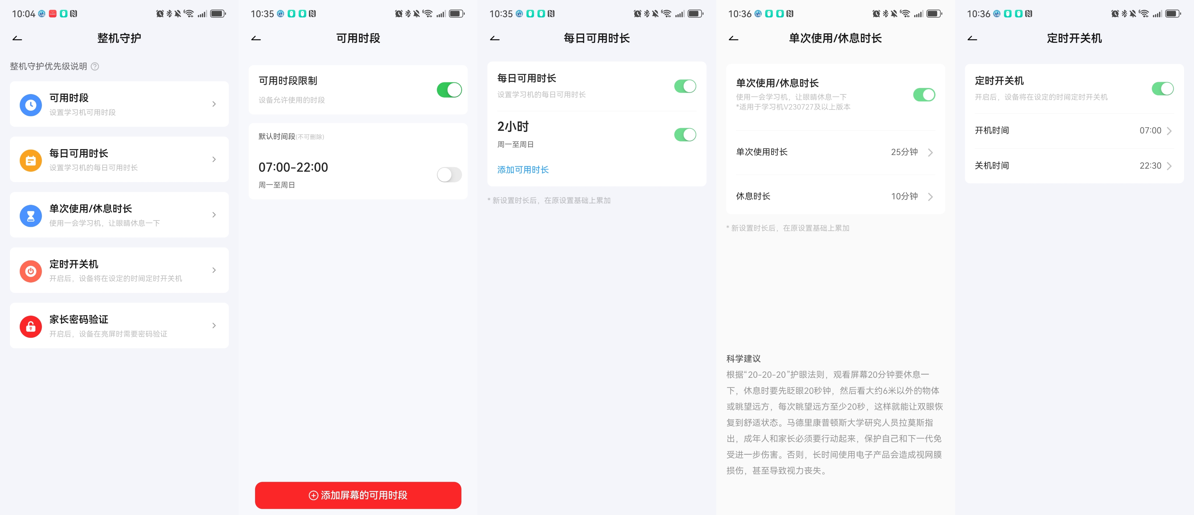 第二个是整机守护,可以设置每天使用的时段和时长;单次使用时长和休息间隔,根据“20-20-20”护眼法则,孩子单次使用学习机到一定时间就强制锁屏,提醒孩子起身,远眺休息眼睛;还可以设置定时自动开关机。