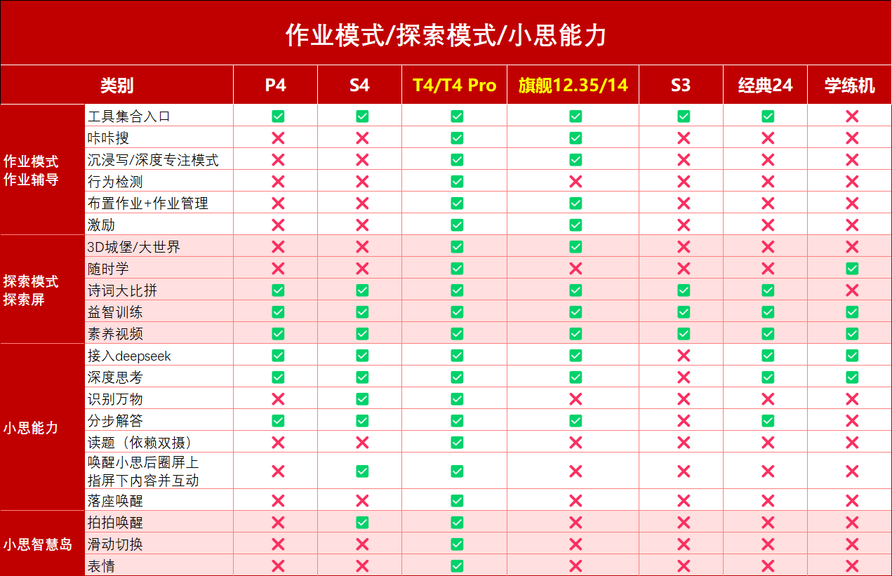 这个新的升级赋予了T4 Pro在作业模式/探索模式和小思能力上其他机型不具备的能力: