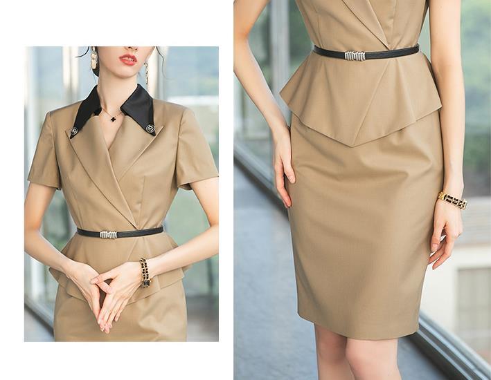 选择柔和而挺括感十足的卡其色西装裙,