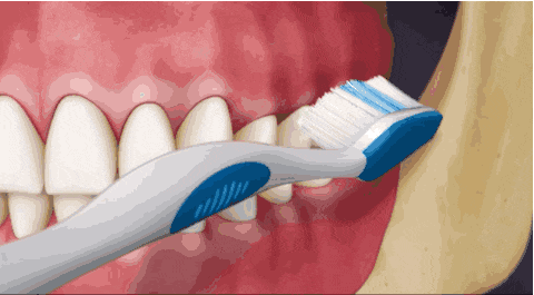 要将牙刷斜 45 度朝向牙龈,放在牙齿和牙龈交界处。