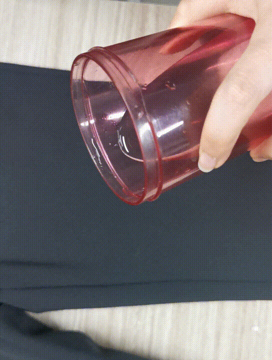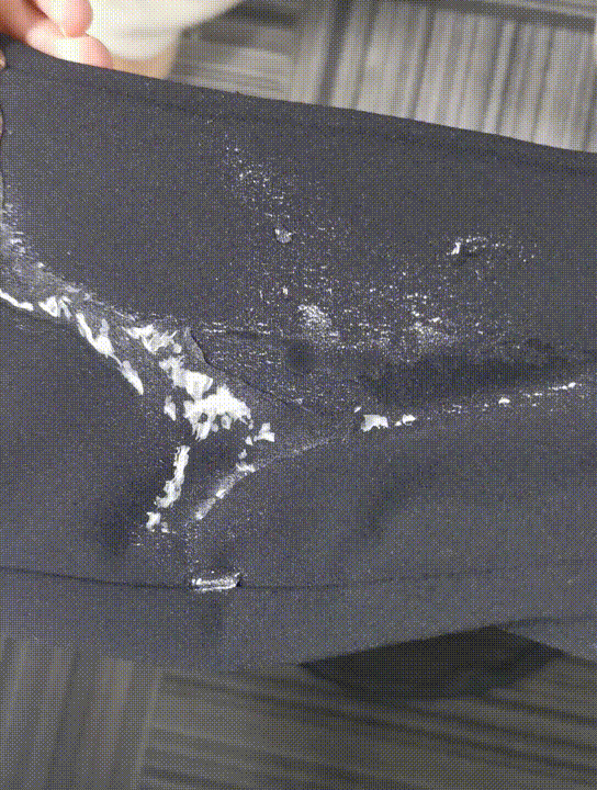水泼洒到面料上会形成斥水层,凝聚成珠,从裤子上滚落。