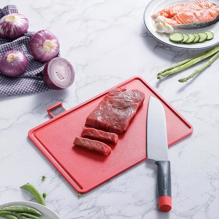 红色、橘色菜板边缘均设有环绕水槽,这样切肉时,汁水就不容易流到台面上。