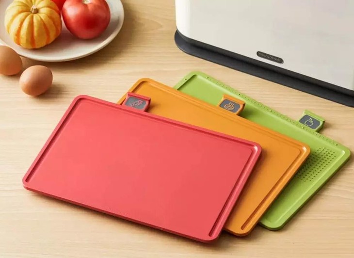 红色是生食刀板:适合处理生肉、海鲜等食材; 橘色是熟食刀板:适合处理熟肉、面包等熟的食材; 绿色是果蔬刀板:适合处理蔬菜、水果等食材。