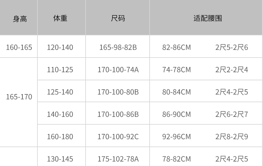 身高从165~190cm,腰围、臀维、裤外长、脚口四个维度都有细致、详细的参考尺寸。
