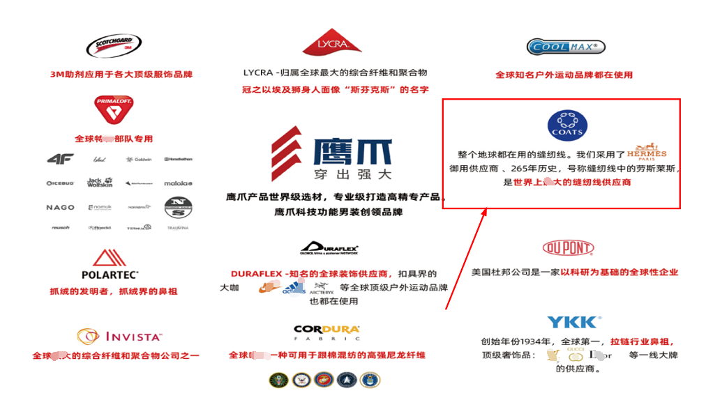 ②一条裤子,面料科技性能+辅料配置,足足利用了全球5家知名供应商:耐磨、抗撕裂,3M科技,吸湿速干、四面弹、辅料(YKK拉链、高士COAST缝纫线)