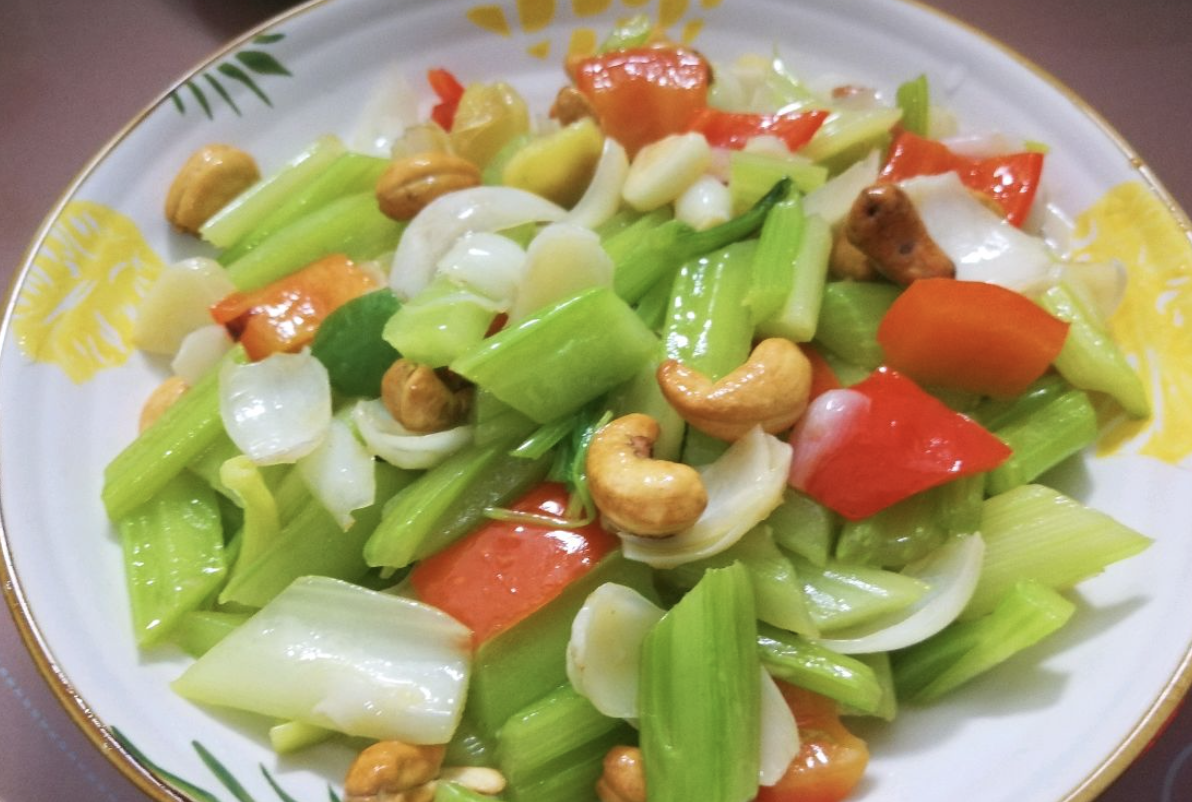 做法:西芹切斜段,与百合一同焯水。热锅快炒,加盐调味,最后放入腰果翻匀出锅。