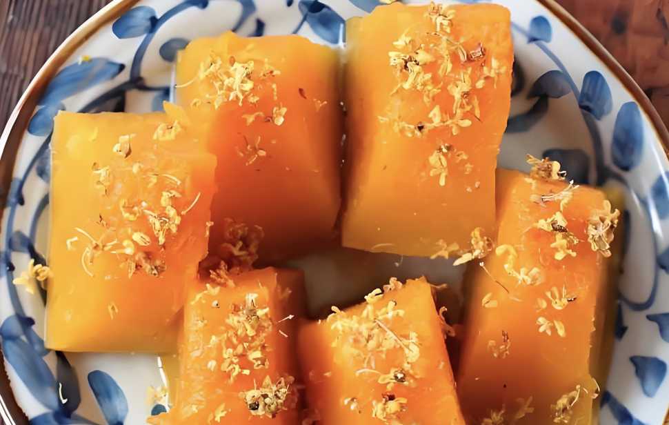 做法:南瓜去瓤切块,上锅蒸15分钟至软熟。淋上蜂蜜,撒上干桂花即可。
