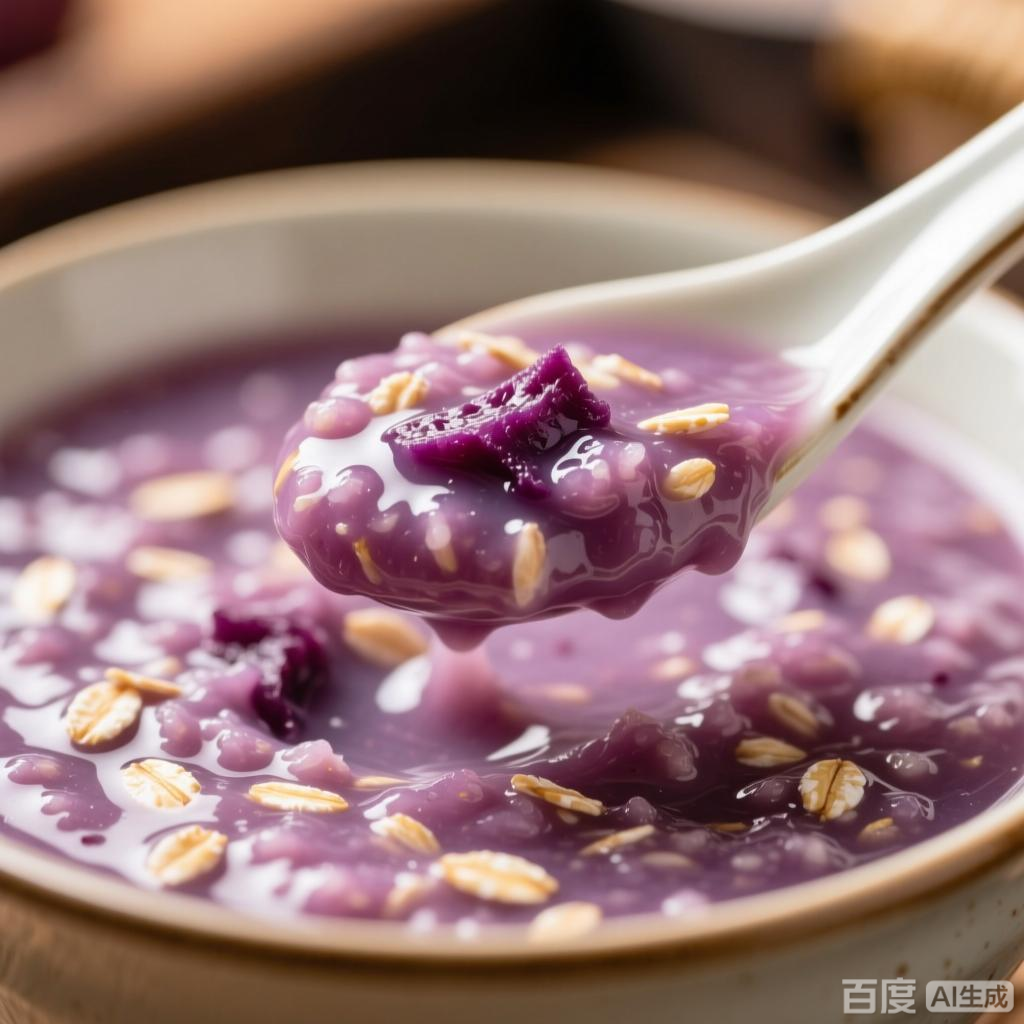 做法:紫薯蒸熟压泥。牛奶煮微沸,加入燕麦片和紫薯泥,搅拌均匀煮2分钟即可。