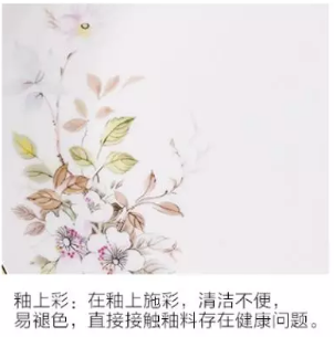 釉上彩就是出窑后上色再二次烧制,成本低、颜色鲜艳、摸着有粗糙感,是大多数平价餐具的选择。