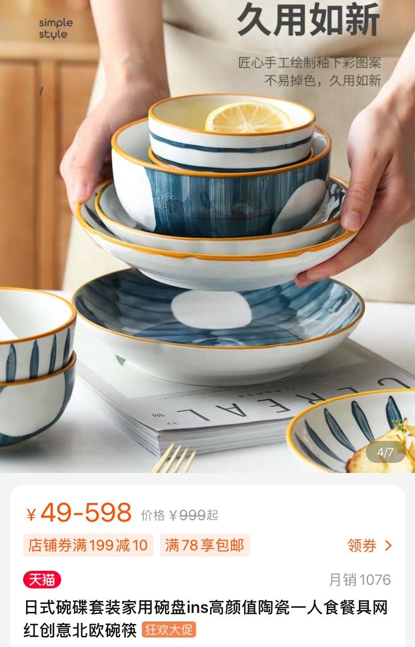 同品质的餐具,某宝上单买一个盘子,也要50+,一套也得要个好几百。