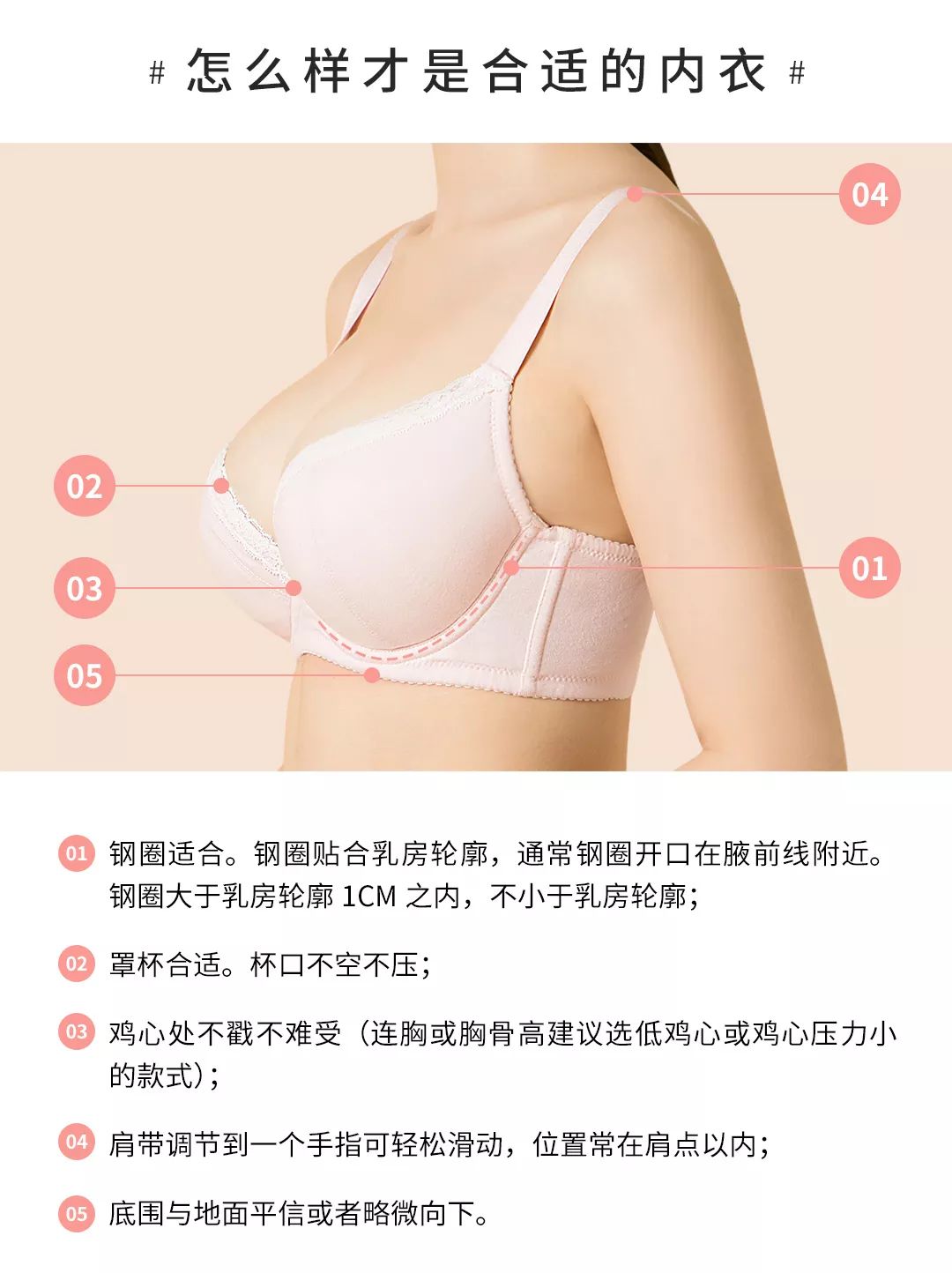 其实,我们在选择内衣时,根据自己的胸型去选择对应的钢圈弧度,让钢圈契合自己的胸型,钢圈不对胸部和乳腺造成压迫,也不用担心钢圈引起的不舒适感啦~