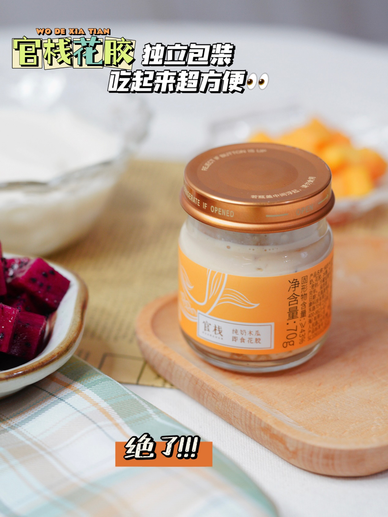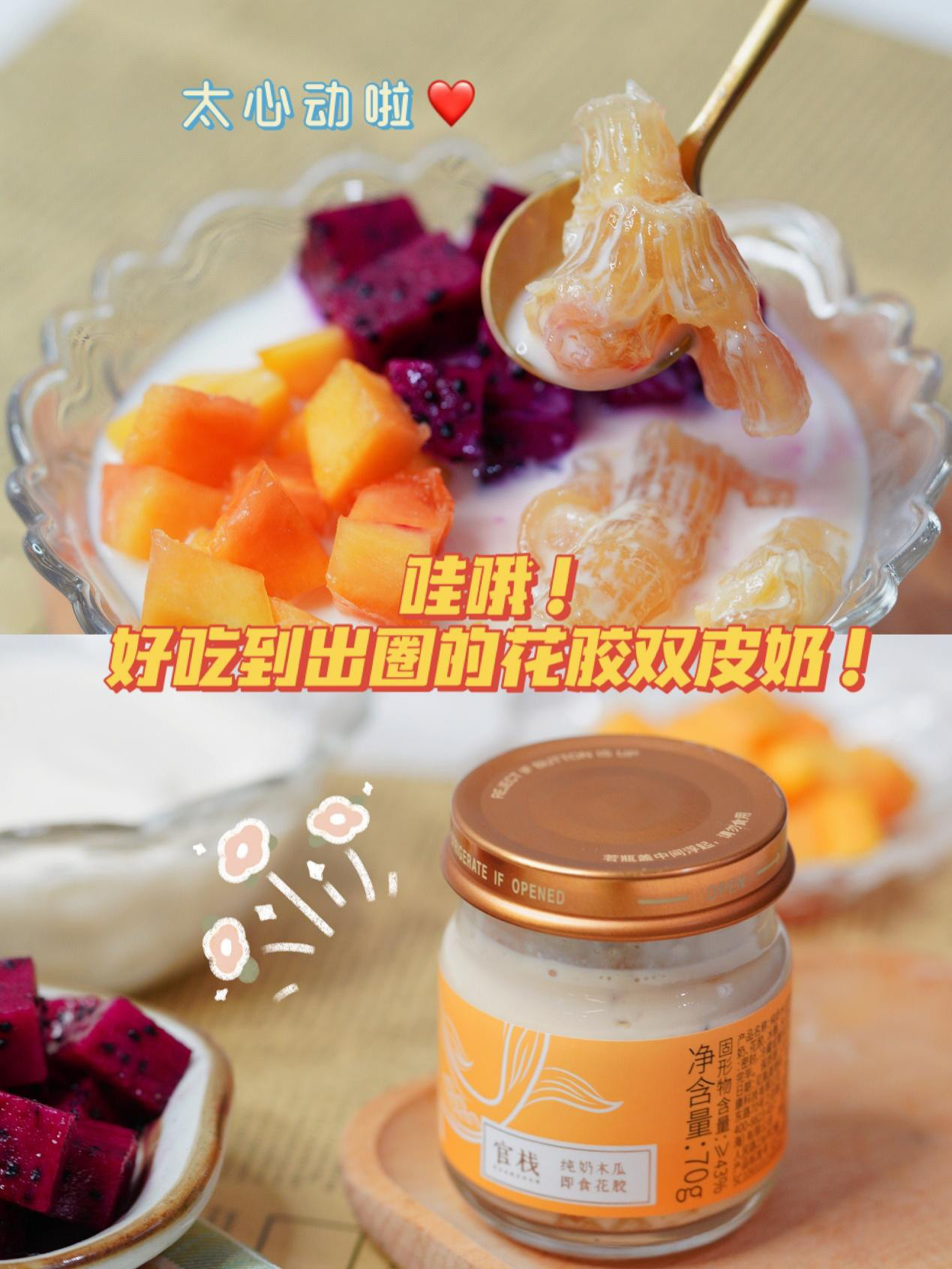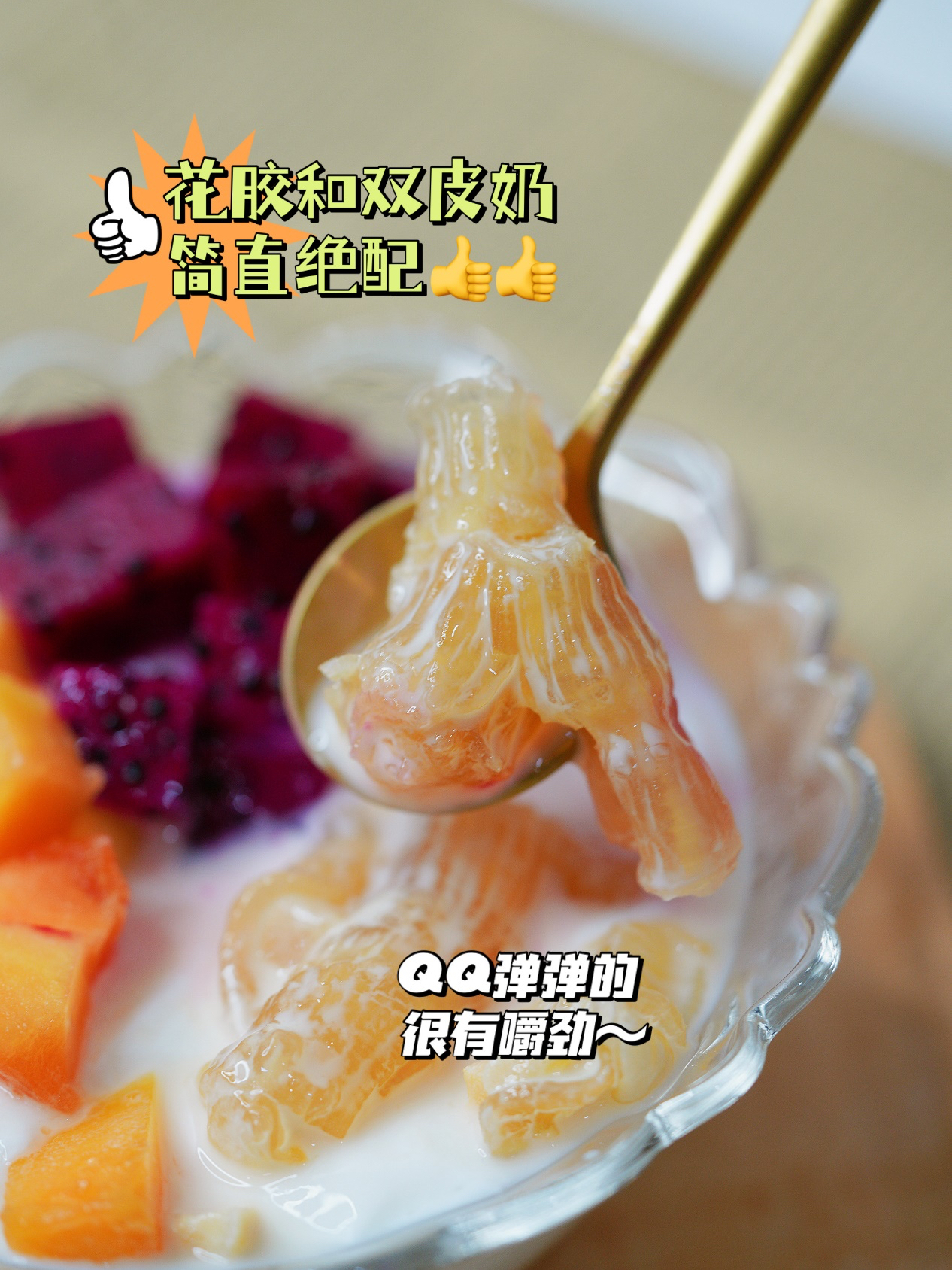 双皮奶的奶味儿浓郁,而且我加的官栈花胶也是用牛奶熬煮出来的,两者搭配一起的口感超级细腻,花胶也是处理的非常干净一点腥味都没有,吃完花胶嘴巴黏黏的,不仅可以吃水果爽口,还能再吃一口双皮奶,不要太幸福,我真的太聪明了,把我最爱的花胶和双皮奶结合,这俩真的绝配