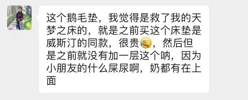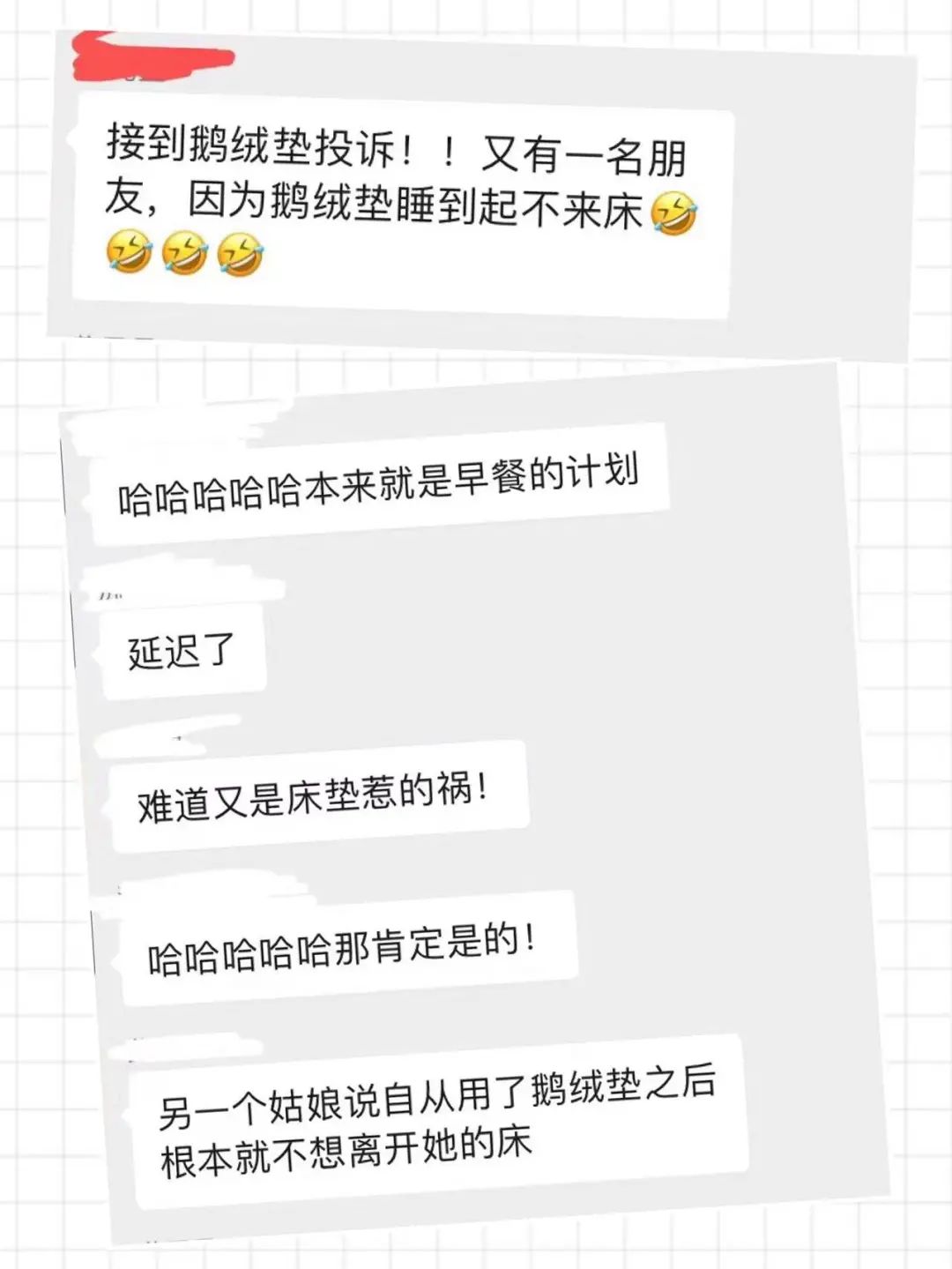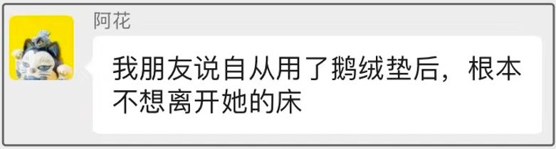 巧的是,她和我在一个群里最近频频被安利同一个牌子的鹅毛垫。群友表示这东西超级舒服,但有“毒”! 因为早上会不想起床害你迟到!