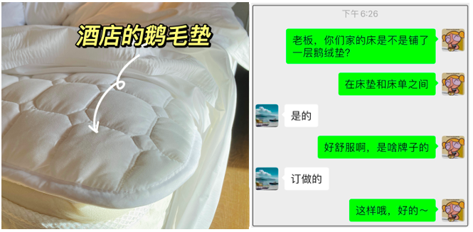 她很好奇到底是什么魔法床垫,掀开发现床垫和床单之间多了层垫子,摸着软软乎乎又很Q弹、目测是鹅毛垫。她专门问了民宿老板,果然是鹅毛垫!坏消息是垫子是订做的,没链接🤷♀️