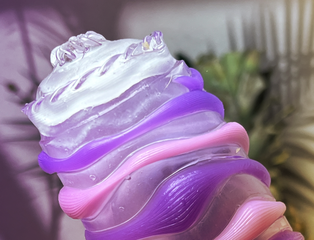 香芋派的内部结构相对简洁,由一条紫色和一条粉色纹路螺旋向下环绕杯壁,且互不交错。在环绕过程中,局部堆积形成凸起纹路,在顺滑的纹路线条基础上,巧妙地增加了刺激点,为使用者带来别具一格的感受。