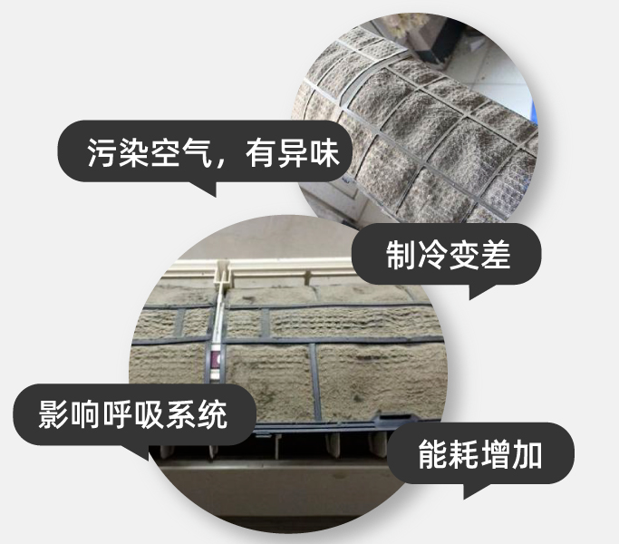 再来认真看一下,长时间没有清洗的空调到底有多脏?空调用久后会布满灰尘和细菌、霉菌不但会增加运行负荷导致制冷效果差,费时费电,更会引发呼吸道感染和空调病。
