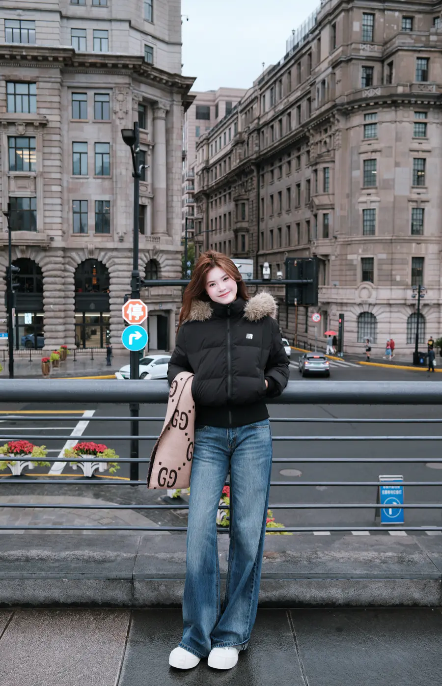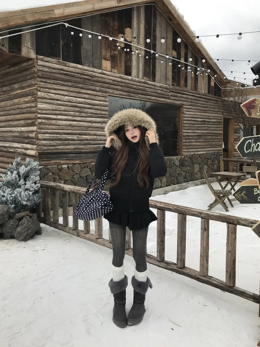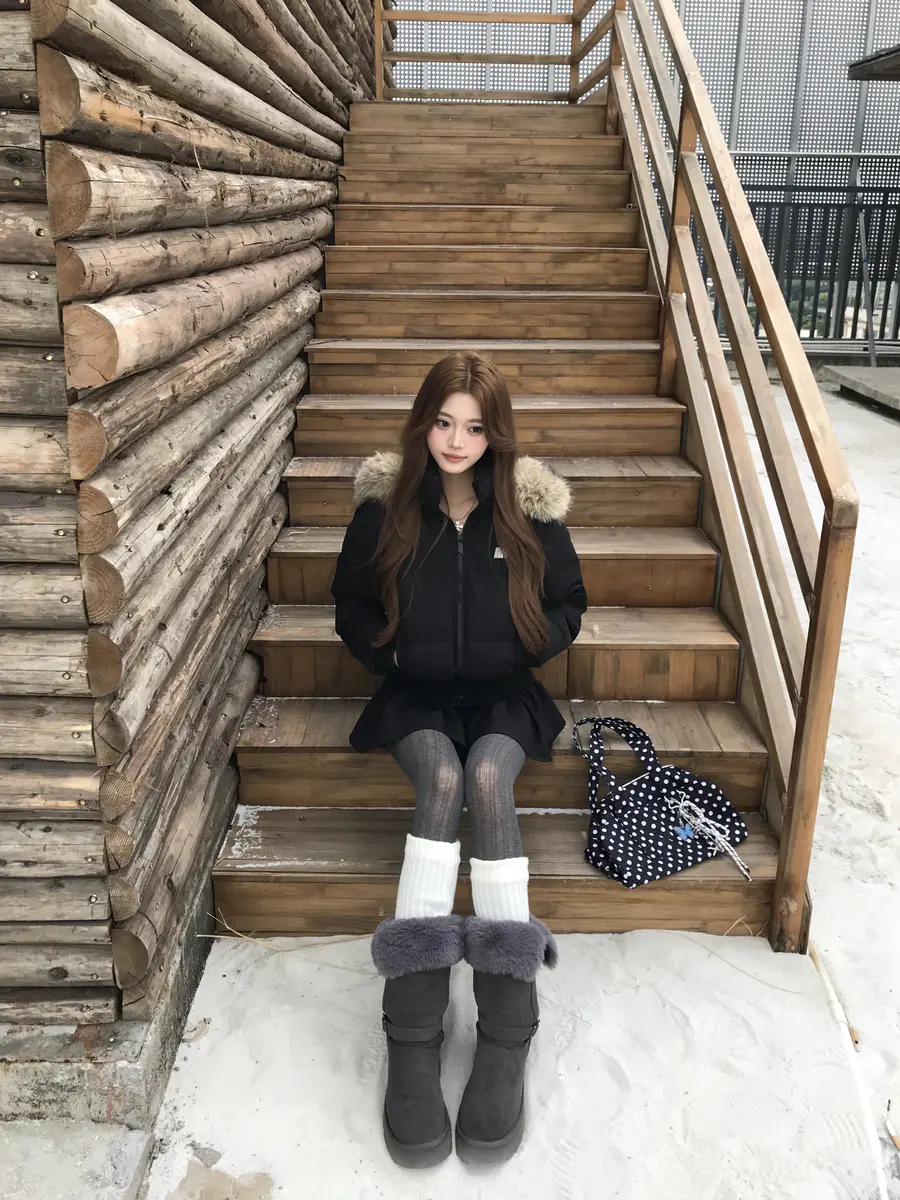 一套好温柔啊,面包羽绒服收腰设计不臃肿,毛领增加氛围感,搭配雪地靴保暖又非常简约高级