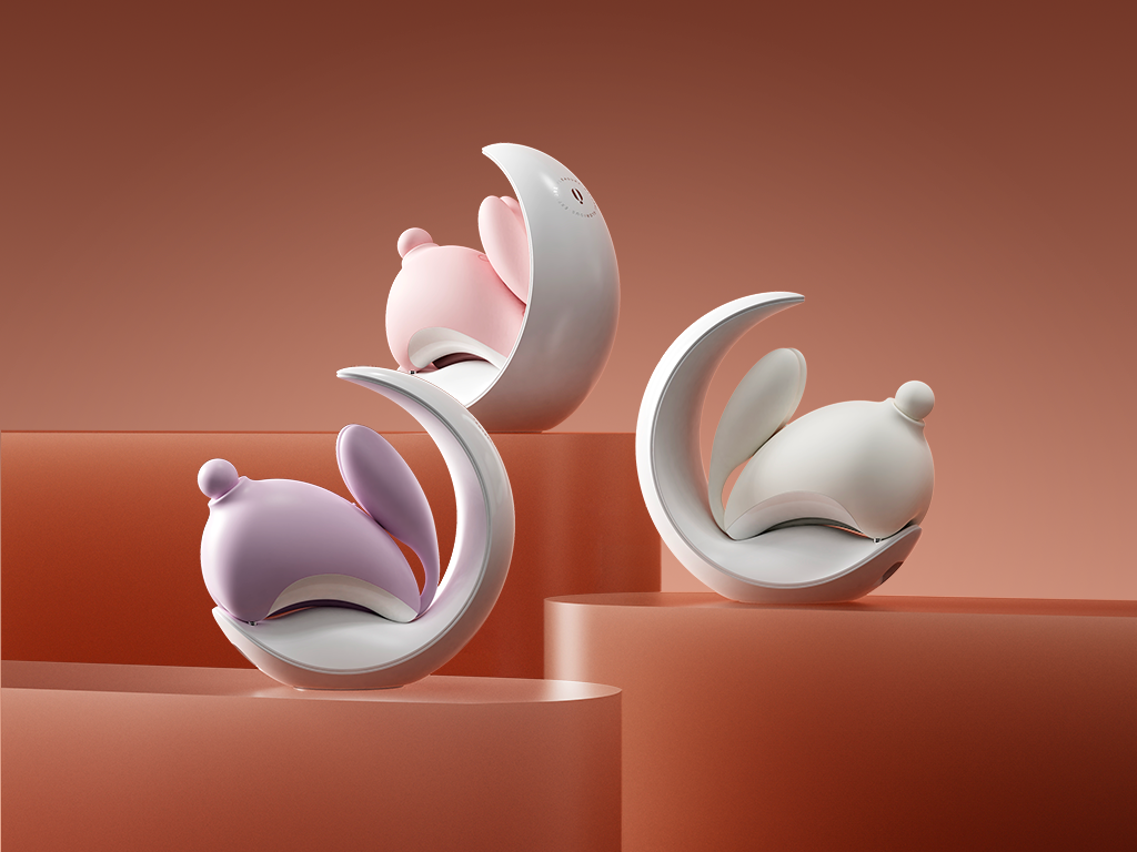 它由一个新月夜灯外观的充电底座,和玩具主体,一只蛰伏的小兔子组成。