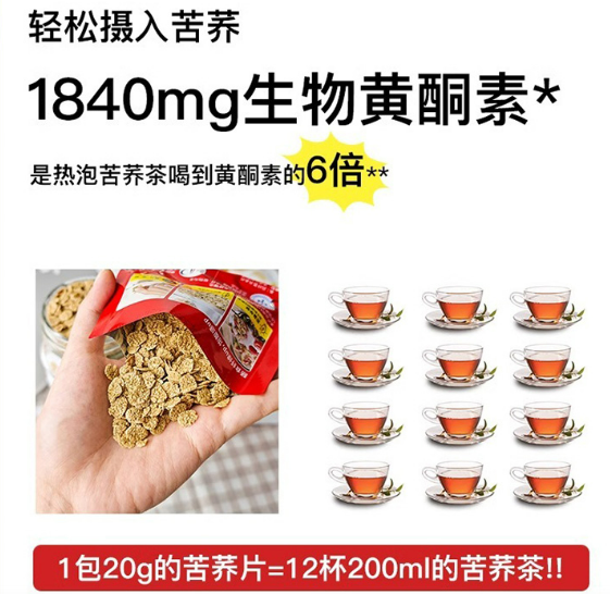 一包20g苦荞片=12杯200ml的苦荞茶,含有1840mg生物黄酮素,是热泡苦荞茶喝到黄酮素的6倍。