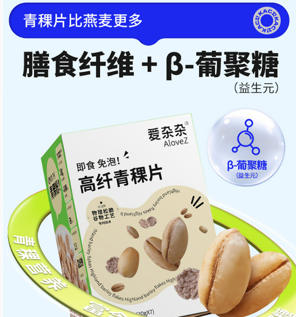 燕麦出名的成分很多人都知道是β葡聚糖,而青稞片中含有比燕麦更多的β葡聚糖,β葡聚糖是一种益生元,是益生菌的食物,不仅可以促进肠道肠道健康,还具有降压降血脂,调节血糖等作用。