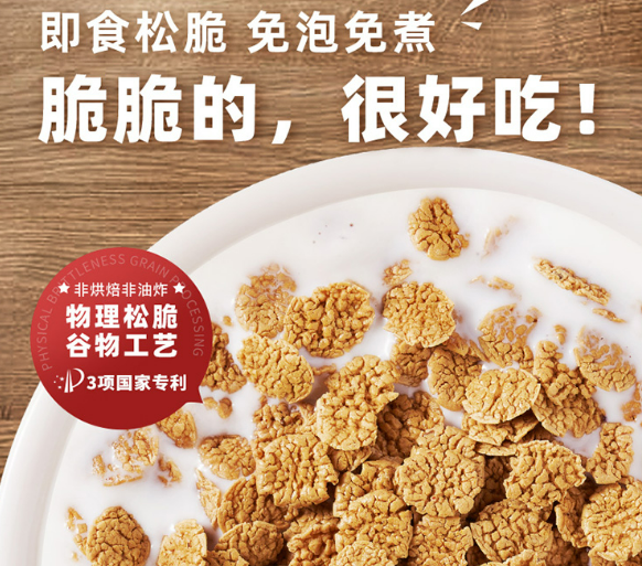 谷物片采用的是顶级食物“白科技”——物理超流膨化,它通过全数控精确度高稳定性,让谷物受压均匀度一致,受压时间低于5分钟,温度分子摩擦温度不超过170°C,不产生过度美拉德焦化反应,让谷物营养干净、口感同时兼得。