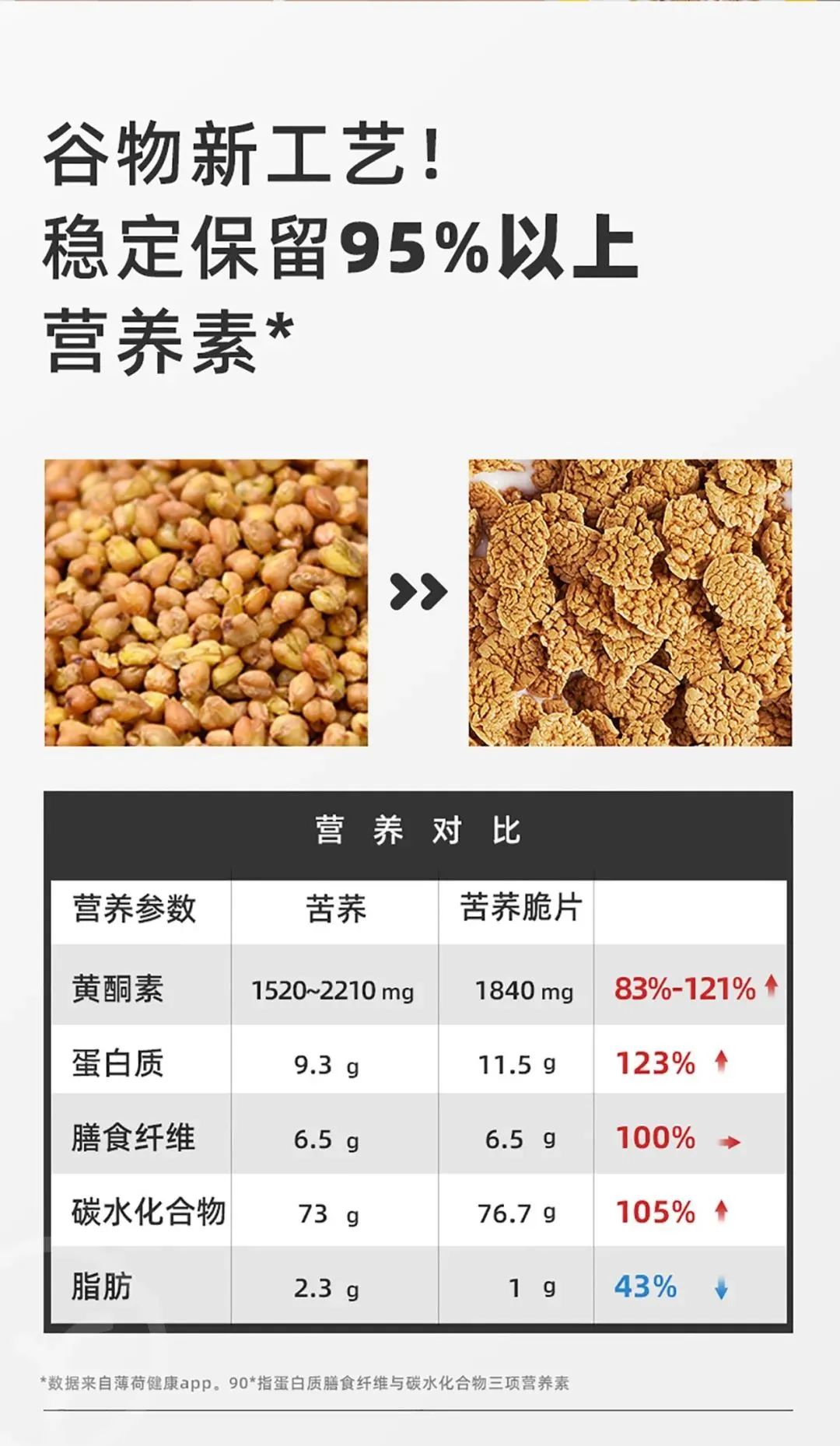 “浅”加工工艺,保留了更高的营养物质,从检测上就能看得出,对比生苦荞黄酮含量保留率达到85%-100%。