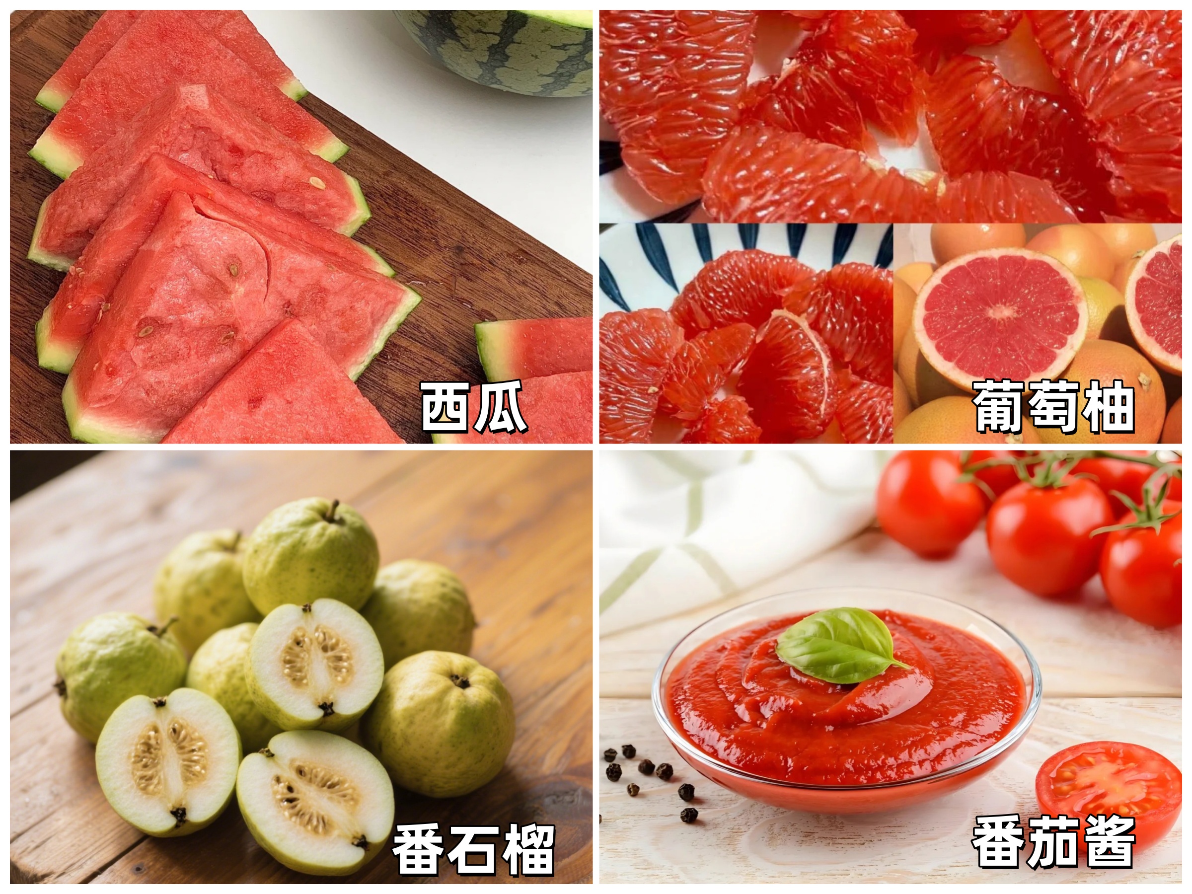比如:番茄酱、番茄汁、番石榴、西瓜、葡萄柚等。