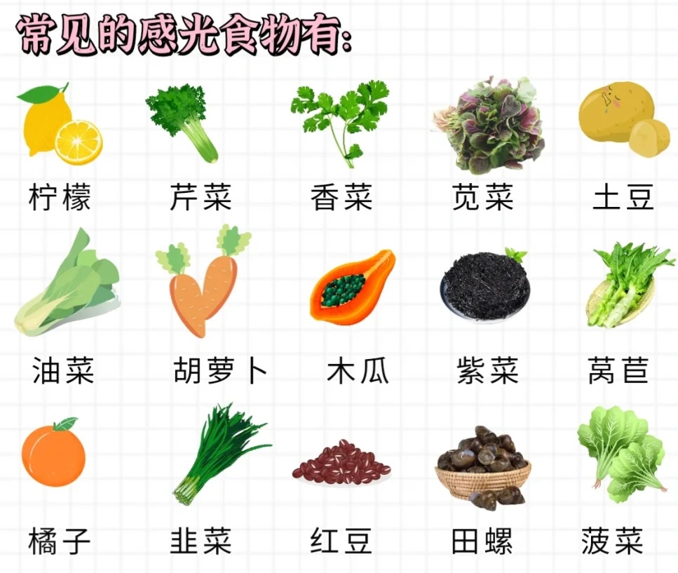 比如:木瓜、土豆、芹菜、香菜、油菜、橘子、无花果、紫菜、菠菜、韭菜、红薯、柠檬、荠菜、莴苣、红豆等。