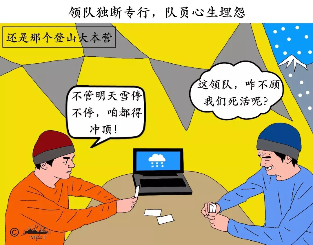守不住,很危险,如果领队对队员的危险行为不加以阻止,比如过了“关门时间”不制止队员登顶,一旦情况恶化,危险倍增。