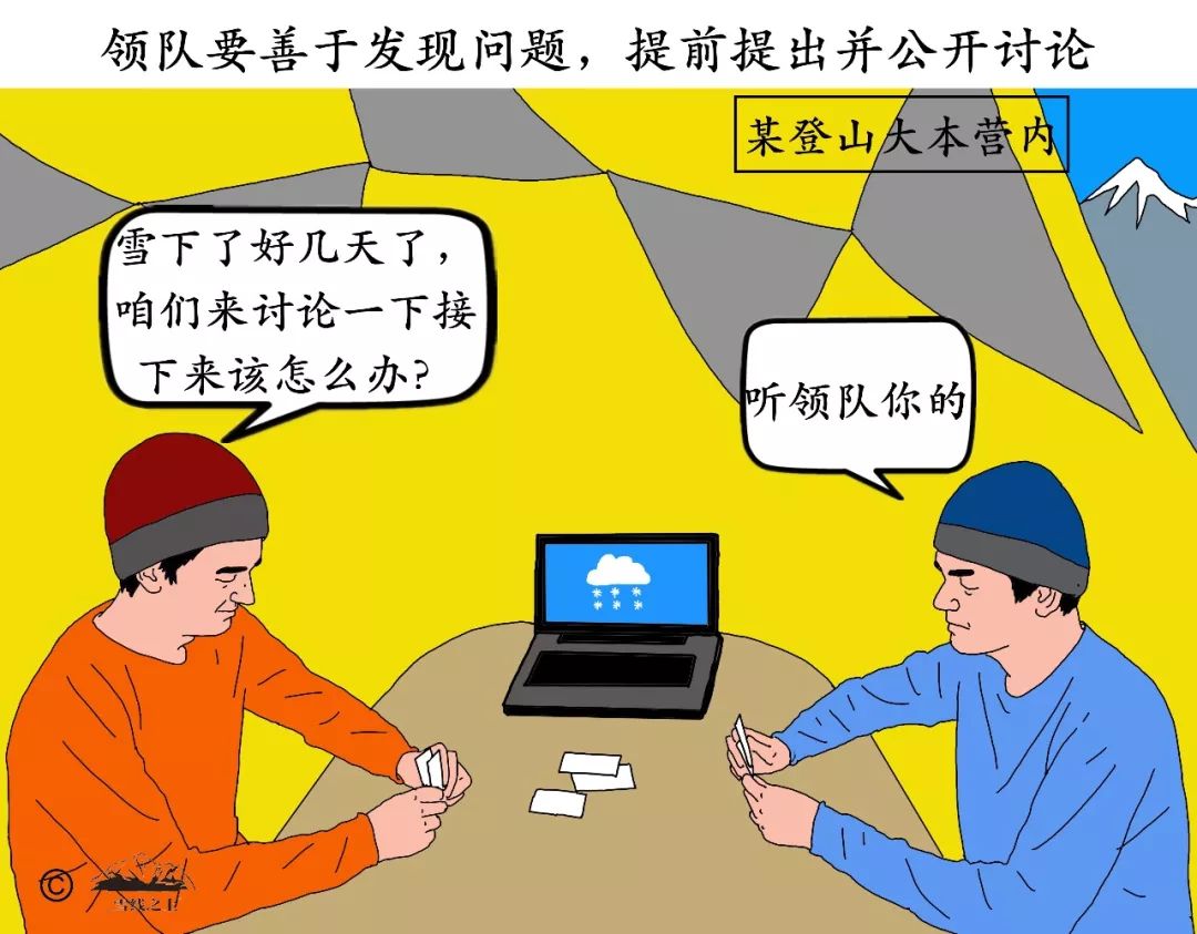 团队登山时,很多问题是大家共同面对的,但却不是每个人都能预料的,经验丰富的领队会及早发现问题,善于“开小会”集思广益,避免独断专行。