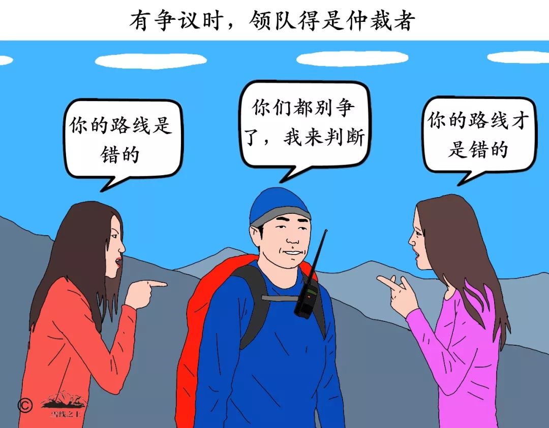 无论是自发组织的队伍,还是俱乐部,领队在团队中都有很大分量,在团队有分歧时就要发挥仲裁作用,及时做出正确裁决,保证活动继续进行。