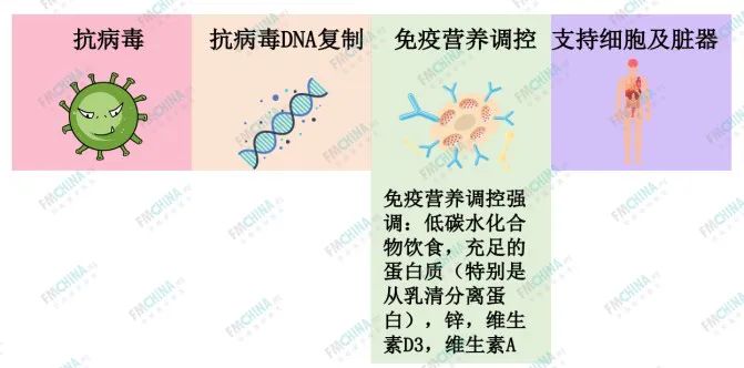 编者按:功能医学指导下针对病毒感染的干预策略,以基础理论及临床数据为支持,制定多维度综合干预方案,对临床医生提供新的思维模式。抗病毒方案主要从以下4个方面进行实施(见图1):