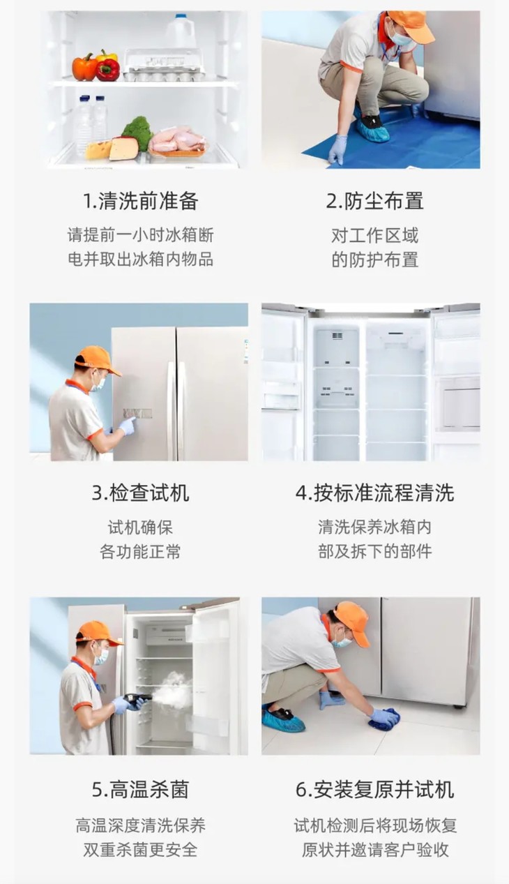 除了平时使用时注意内部卫生之外,对冰箱的清洗最好是找专业人员来完成。省时省力的同时从清洗、杀菌、消毒、除霜,到去除异味等一次全部完成,让您的冰箱洁净如新。