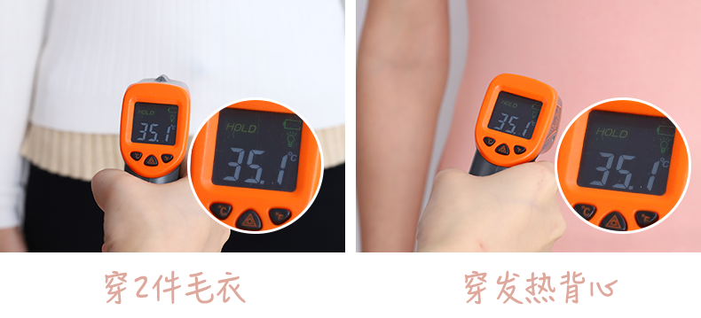 在同一温度下15分钟,穿2件毛衣和穿一件“发热背心”的温度都是35.1℃!真不是空口说白话的。