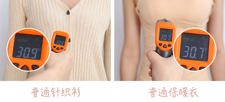 在15℃室内,外面只穿件普通针织毛衣待10分钟,温度仅有30.9℃;而普通保暖内衣只有30.7℃。