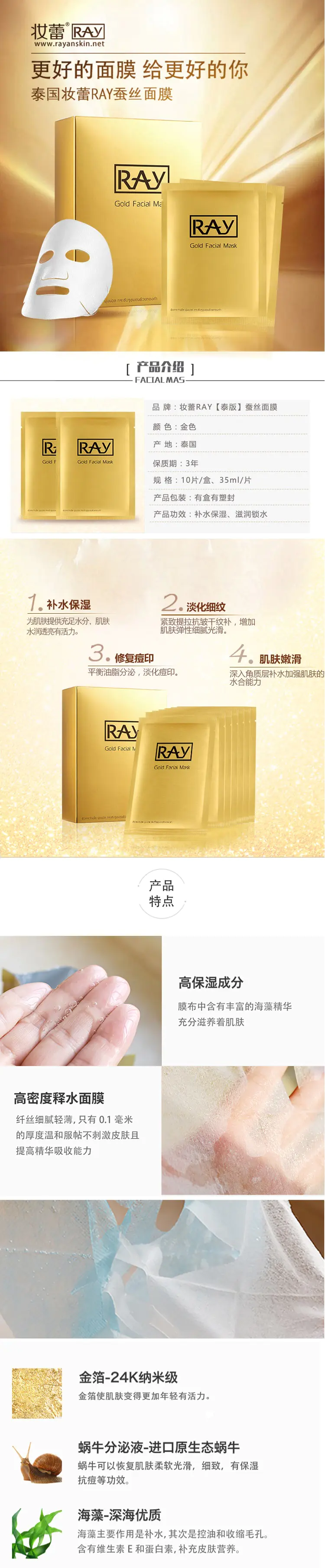 3.❗效果是同类面膜中相当好的。RAY面膜特含有的金箔,作为活性金超细粒子使用,可提高肌肤的通透性、调节肌肤酸碱滋养肌肤、防止紫外线的伤害,排除毒素,防止色素生成,并与珍珠、人参等萃取液结合,成为导湿因子,有效保持肌肤水分,长期使用能促进皮肤新陈代谢,使皮肤光滑细腻,保持青春活力。