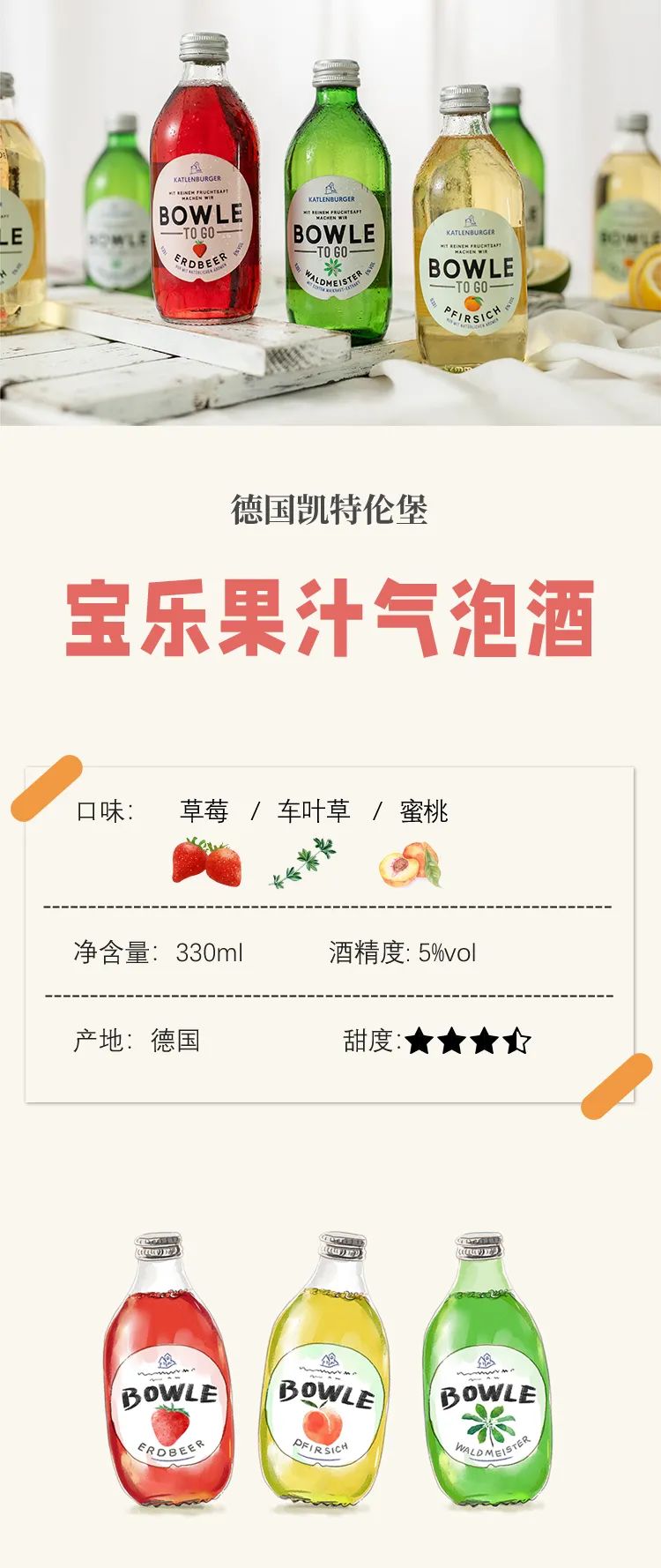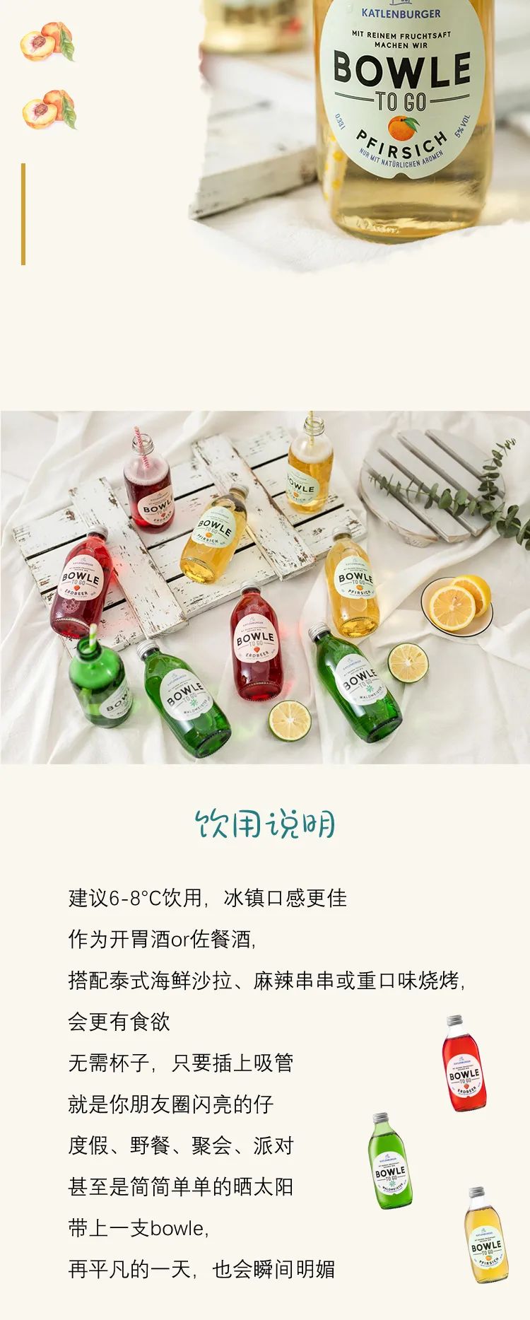 纯天然、无添加,口感清爽,不添加任何人工香精。这是来自德国凯特伦堡(Katlenburger)的小宝乐酒(Bowle)一直的秉持。