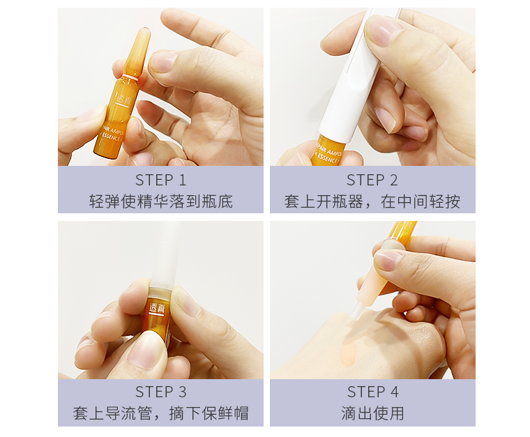 每一盒安瓶精华里面都配有开瓶器和导流管,非常方便,容易掰开,如果一次用不完,可以用盖好导流管,放在阴凉处,建议当天使用完毕哟