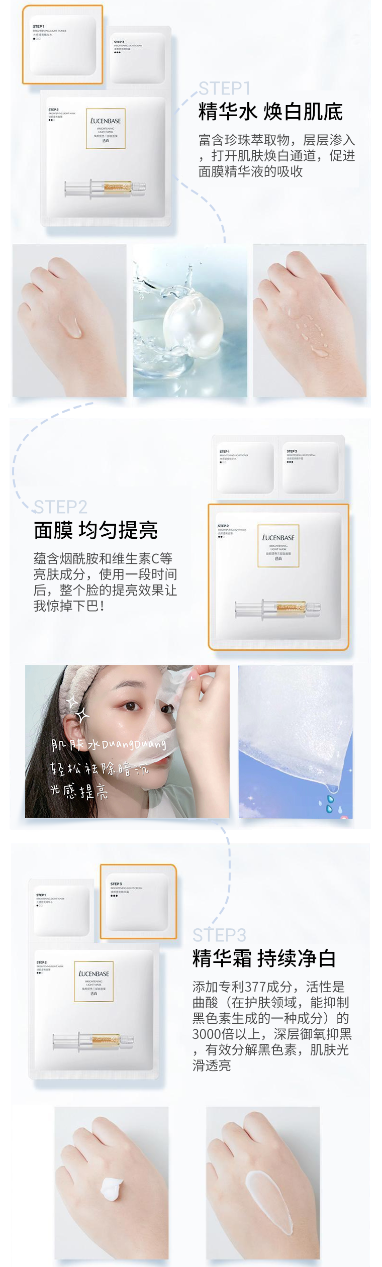 精华水,面膜,保湿霜=美白功效×3,每次敷都超级舒服,坚持敷,基本上暗沉粗糙都不会有,就像是天生自然白的感觉,美白急救王!补水又是100分选手!
