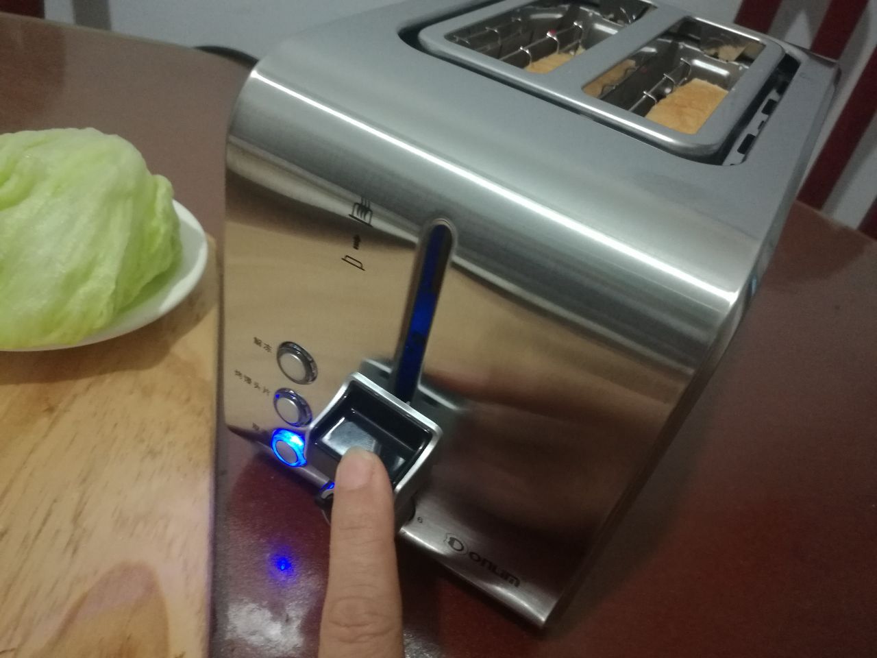 3、放入吐司片,调2档,轻轻按下,听到“叮”的一声清脆的铃声,吐司片烤好了,自动弹起