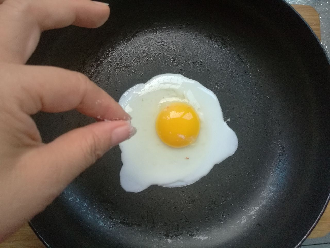 1、平底锅烧热,刷一层食用油,打入鸡蛋,撒上一丢丢盐