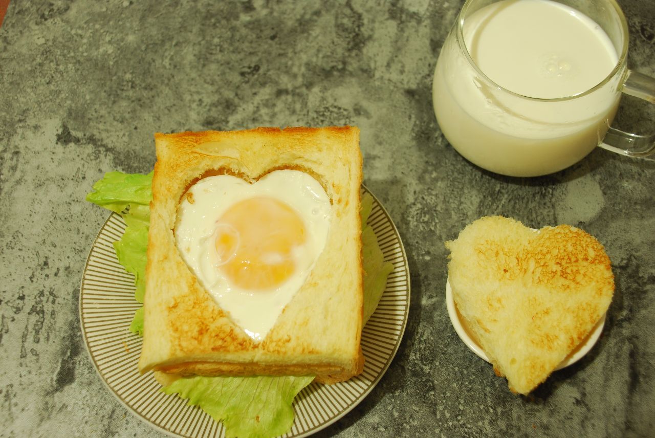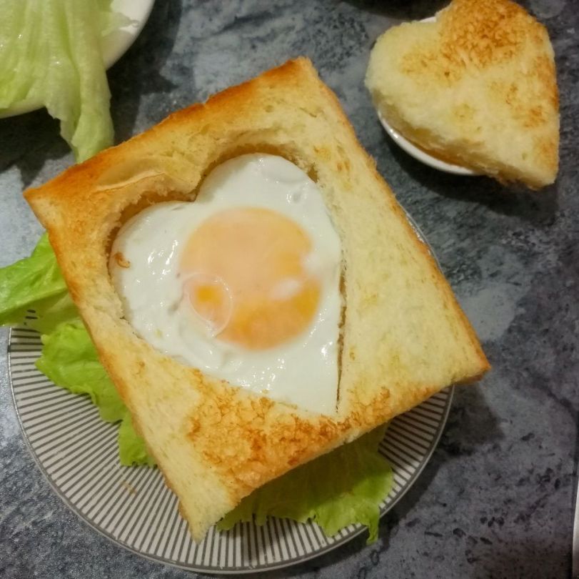 4、吐司片涂上上沙拉酱,撒上肉松、西生菜,心形鸡蛋放进中间,心意满满三明治就做好了