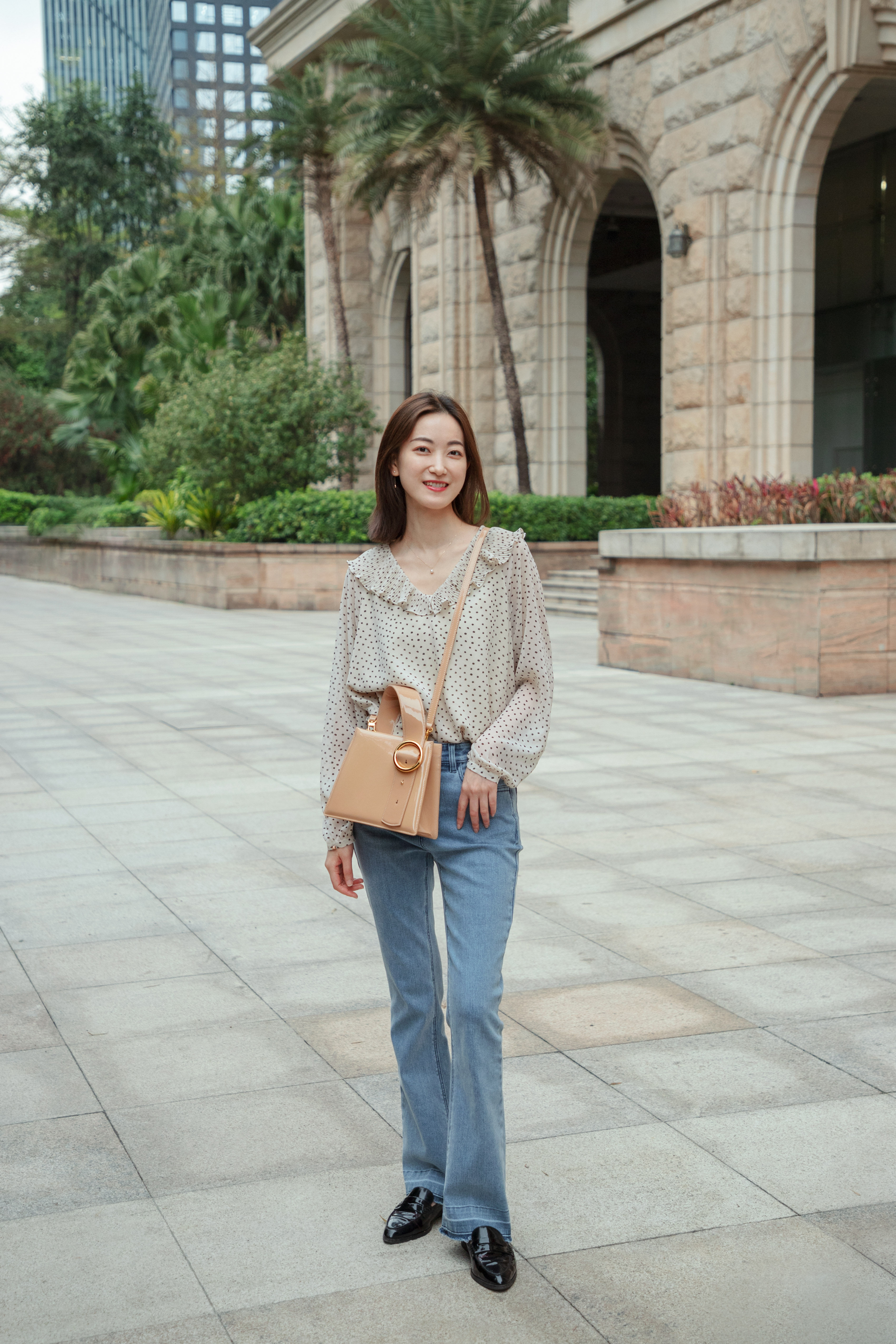 波点元素总是可以吸引眼球~这件少女感满满的田园风雪纺波点上衣,款式经典耐看,宽松的A字版型V领的设计,不挑身形,很百搭!简单搭配一件浅蓝色微喇牛仔裤就可以眼前一亮了~是上班通勤穿很百搭的组合!